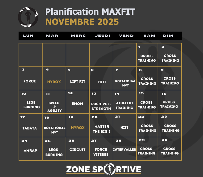 Nous offrons une plage horaire variée qui suit une thématique journalière. Nos entraîneurs qualifiés créent un entraînement différent tous les jours tout en s’assurant d’apporter une grande variété d’exercices d’un jour à l’autre. Le calendrier ci-dessous indique la thématique du jour pour tout le mois, permettant à chacun de choisir les cours qu’ils préfèrent. Vous pouvez compter sur nous, chaque cours sera unique.