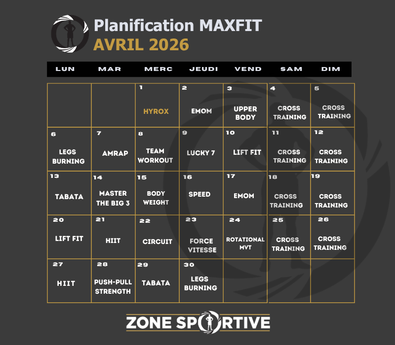 Nous offrons une plage horaire variée qui suit une thématique journalière. Nos entraîneurs qualifiés créent un entraînement différent tous les jours tout en s’assurant d’apporter une grande variété d’exercices d’un jour à l’autre. Le calendrier ci-dessous indique la thématique du jour pour tout le mois, permettant à chacun de choisir les cours qu’ils préfèrent. Vous pouvez compter sur nous, chaque cours sera unique.